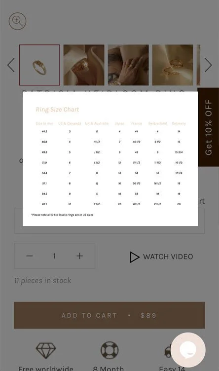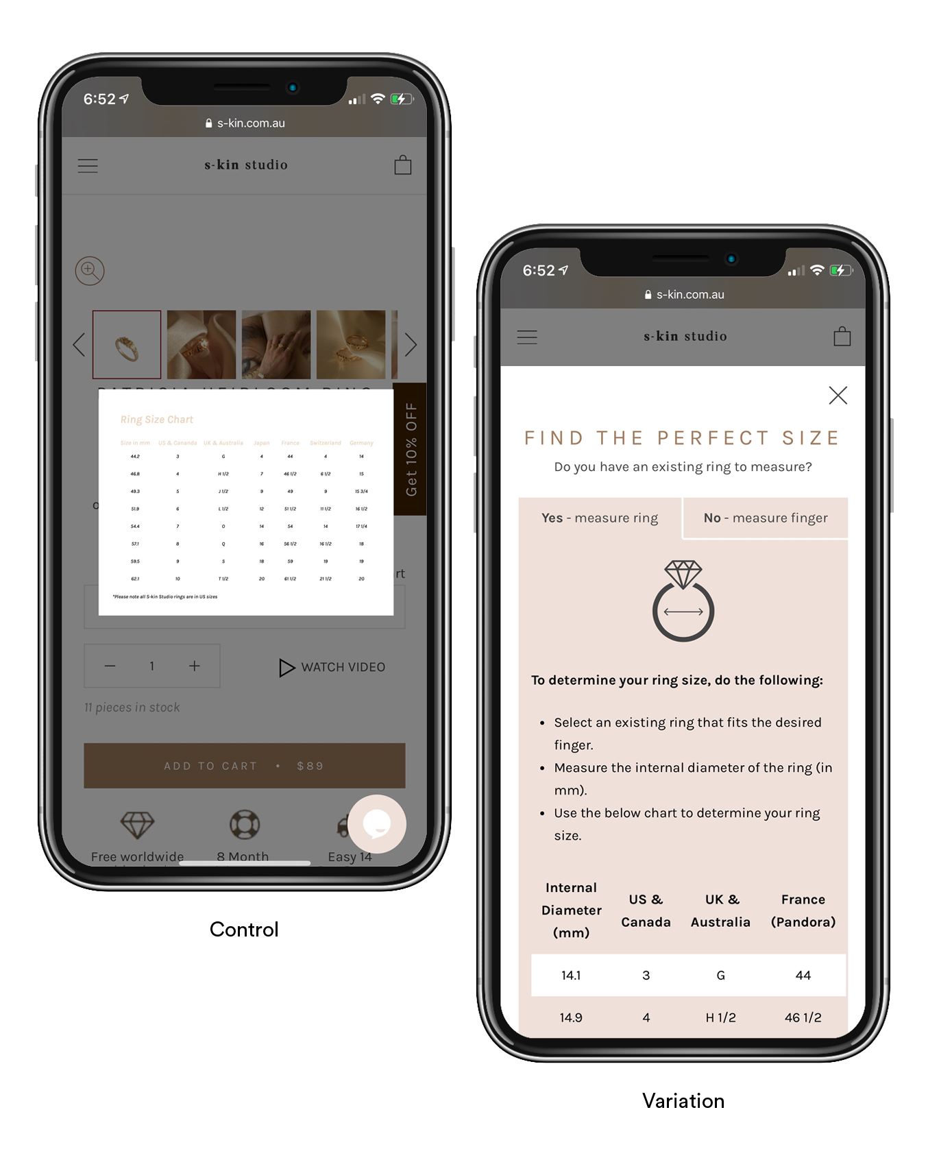 Competitor analysis uncovered that other jewellery brands offer assistance to help users easily find the right ring size without leaving the product page. The hypothesis for this test was that by optimising the current ring size pop-up, instead of sending users away for instructions, users would be more likely to purchase rings if it was easier for them to choose the right size.