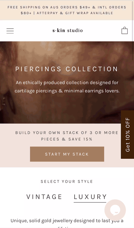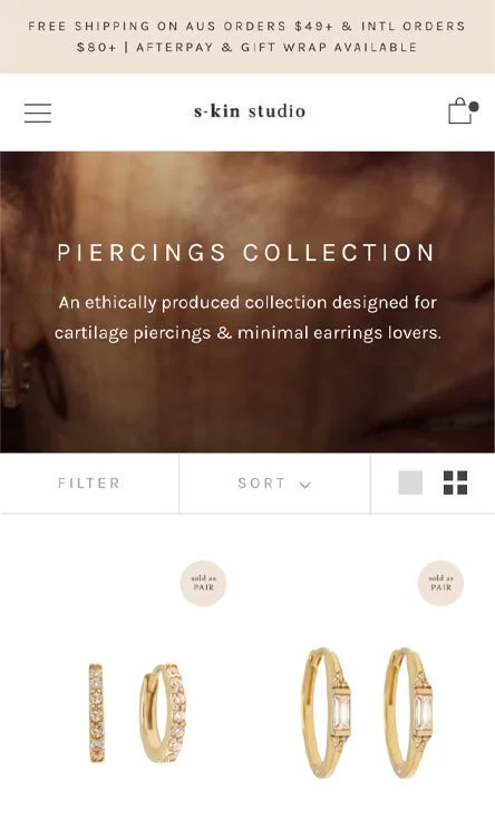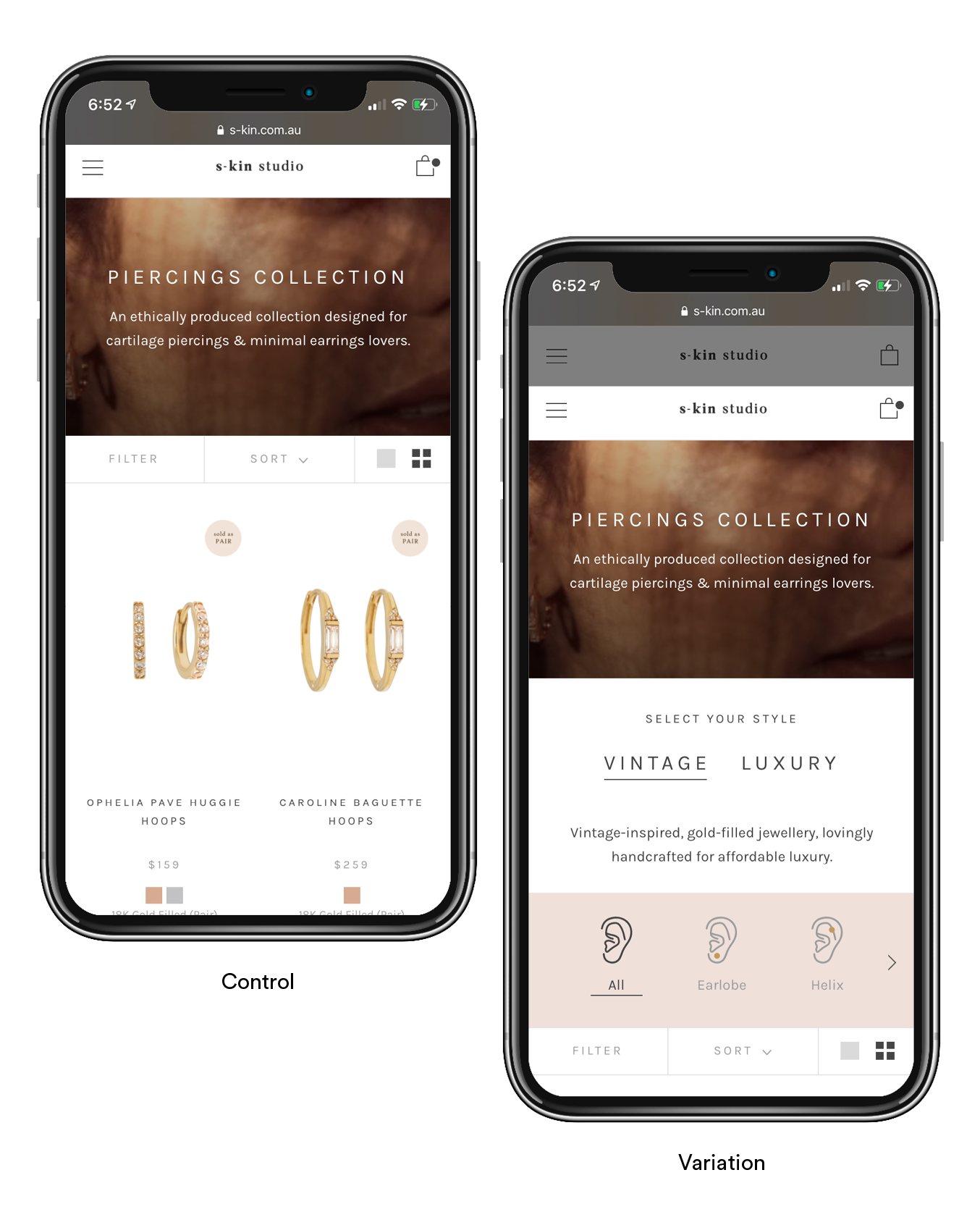 Implementing a visual filter on the piercings category page allowed users to filter products based on the type of the piercing they were searching for. The addition of the Vintage and Luxury tabs also educated users around the different materials used for the products, which in turn explained the differing price points.