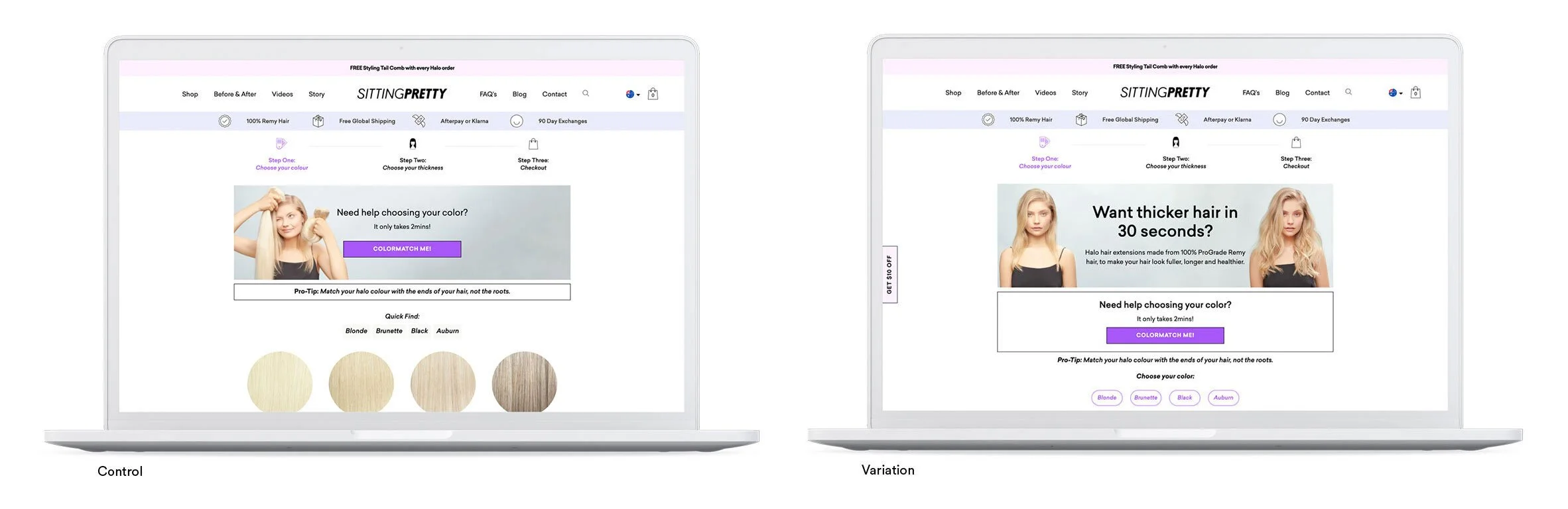 70% of Sitting Pretty users were abandoning the checkout to visit the Before & Afters and FAQs, suggesting users required more answers before proceeding to the checkout. User polls revealed that a common concern was selecting the right colour halo, many were also unaware of Sitting Pretty’s 90 day exchange policy.