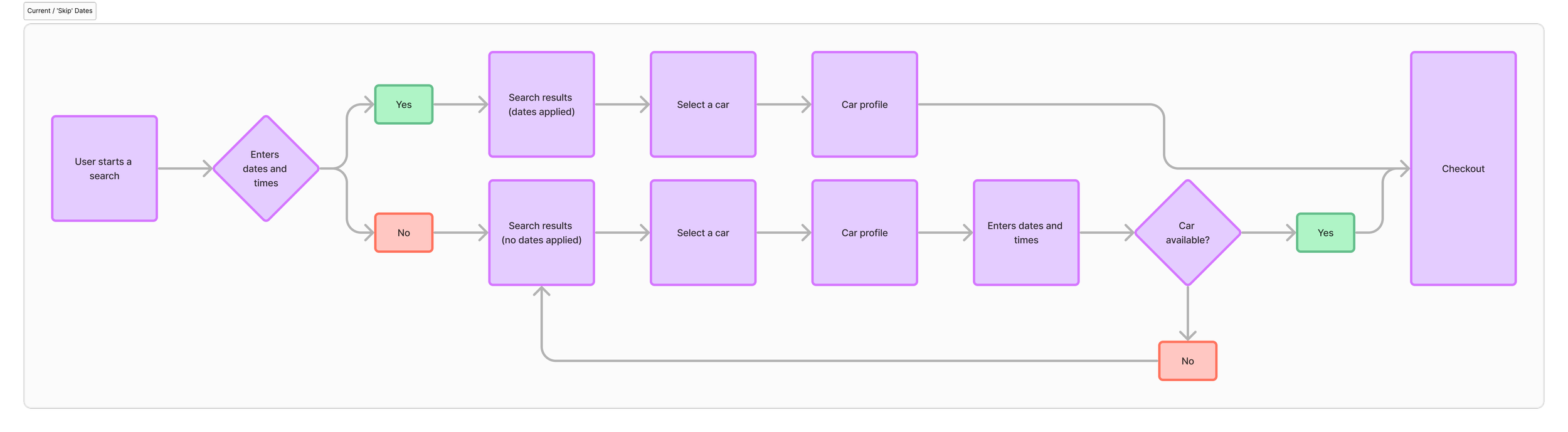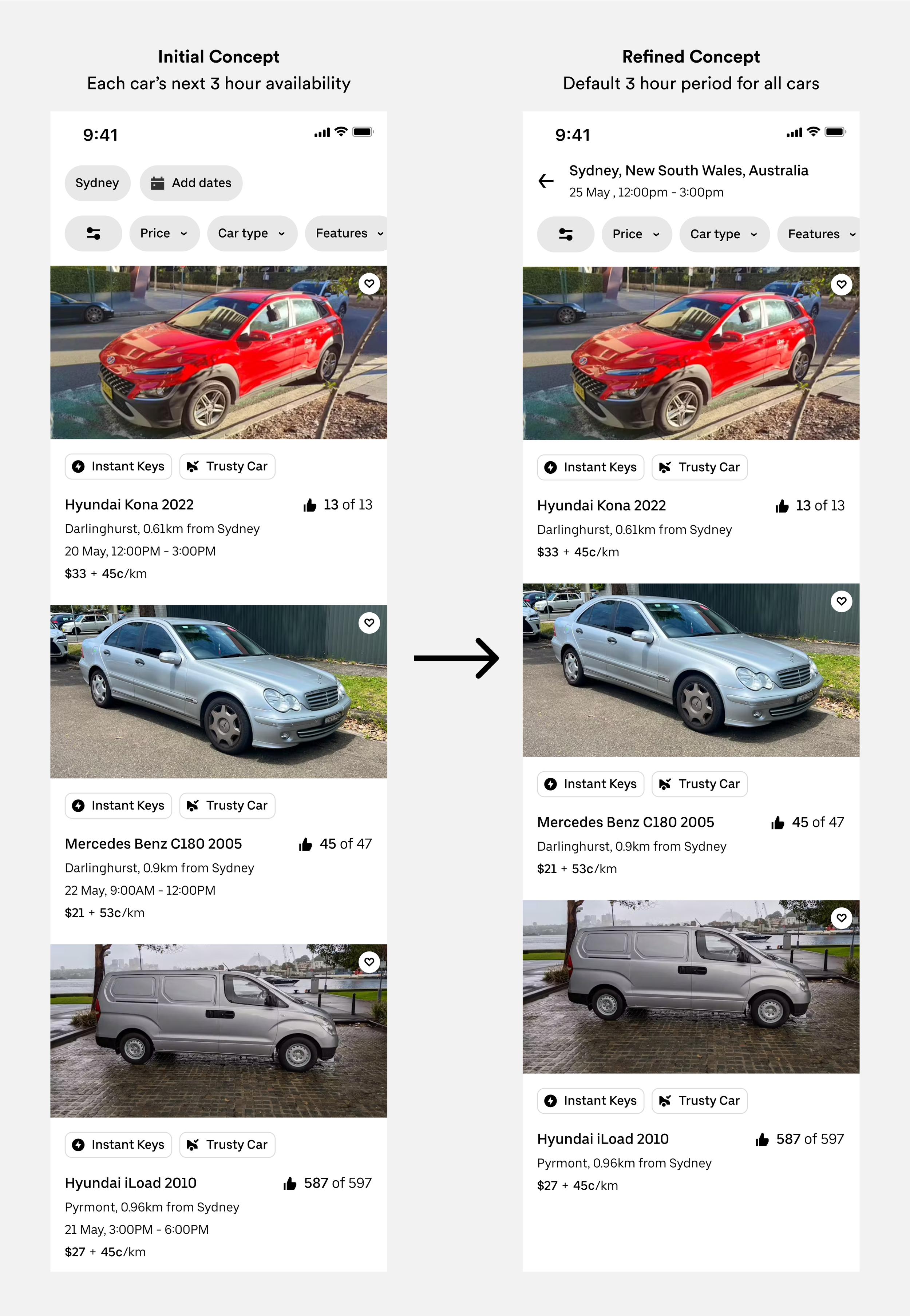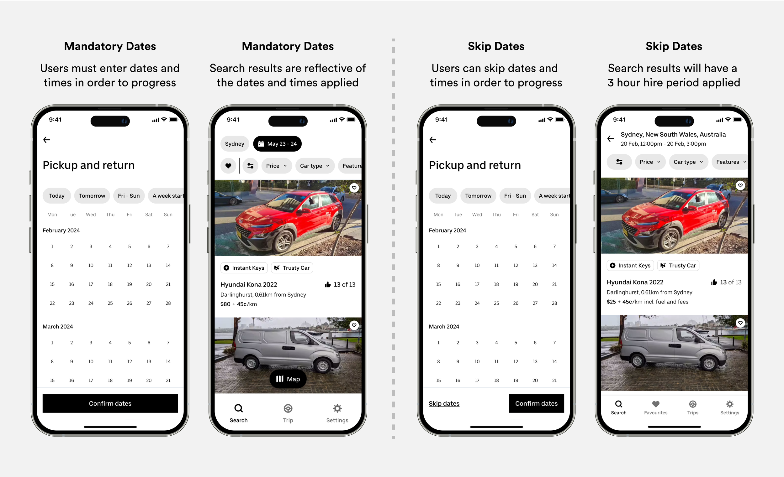 I explored an alternative that would retain the “skip dates” option while applying a 3-hour hire period based on each car’s next availability. The 3-hour duration was chosen based on user data indicating typical trip lengths, and the concept was inspired by Airbnb’s approach, where a trip period is applied to all search results even if users do not enter specific dates.