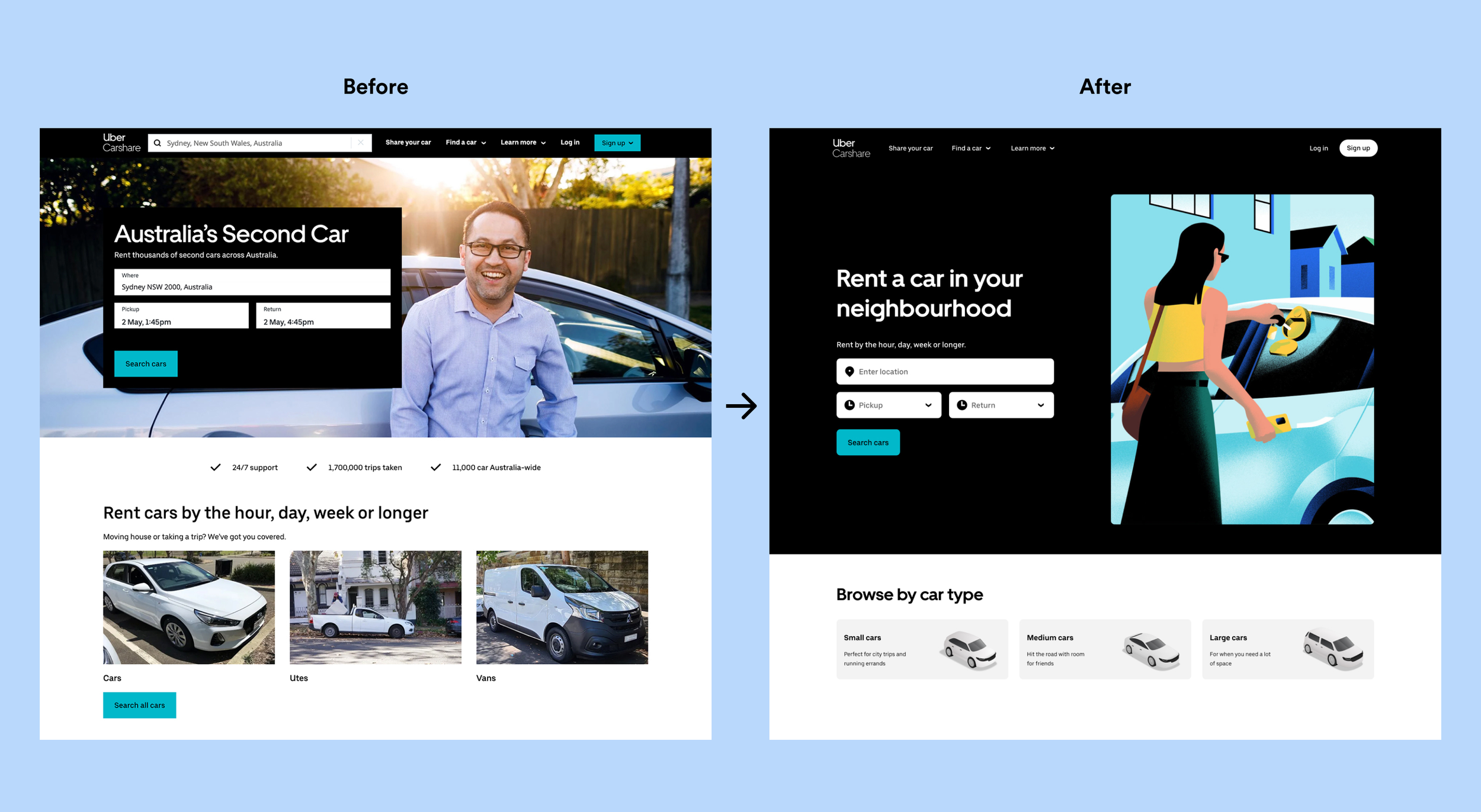 On the desktop homepage, further adjustments were made to simplify the search funnel, such as removing the search banner from the web header. This change ensured that all users must start a search through the main CTA and apply dates and times to progress. Additional UI updates were also made to better align the desktop experience with Uber’s branding.